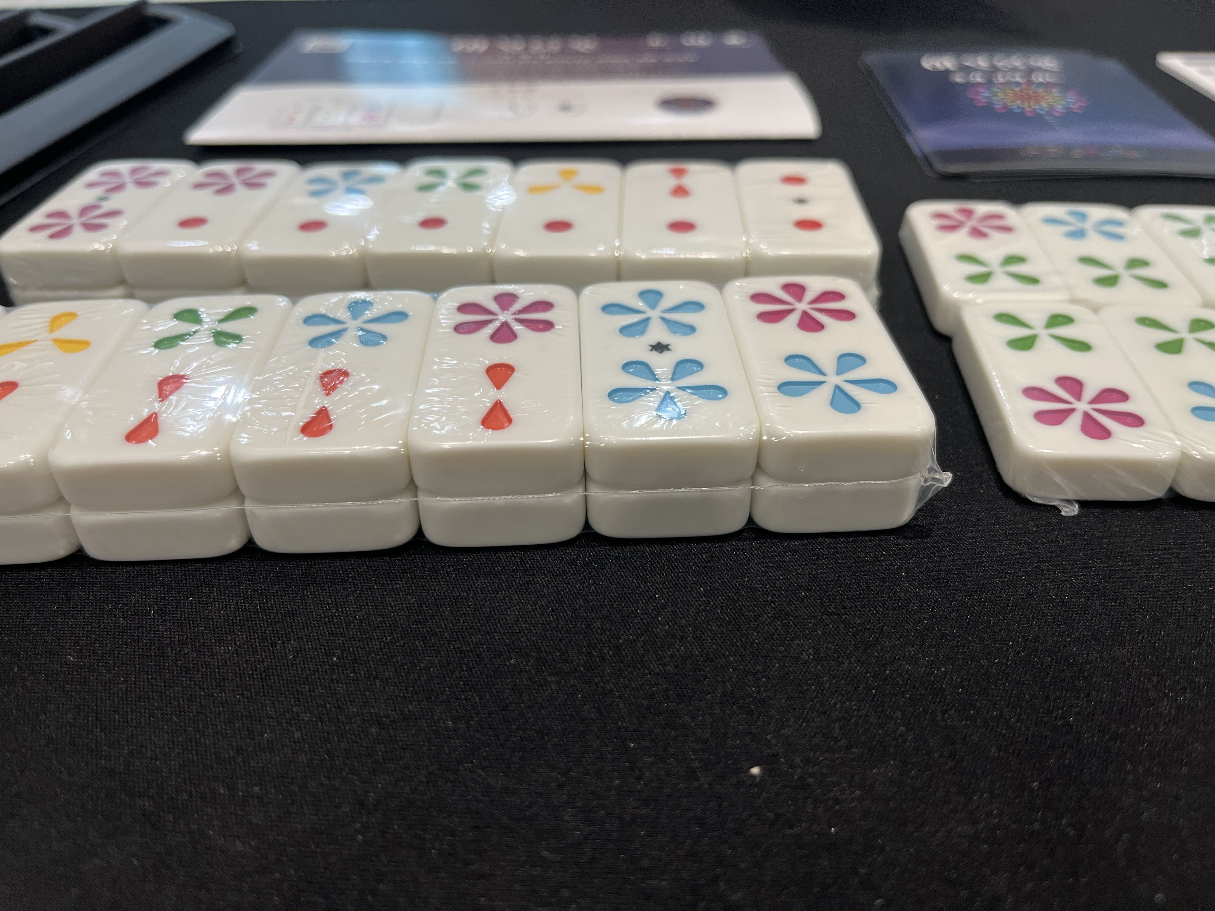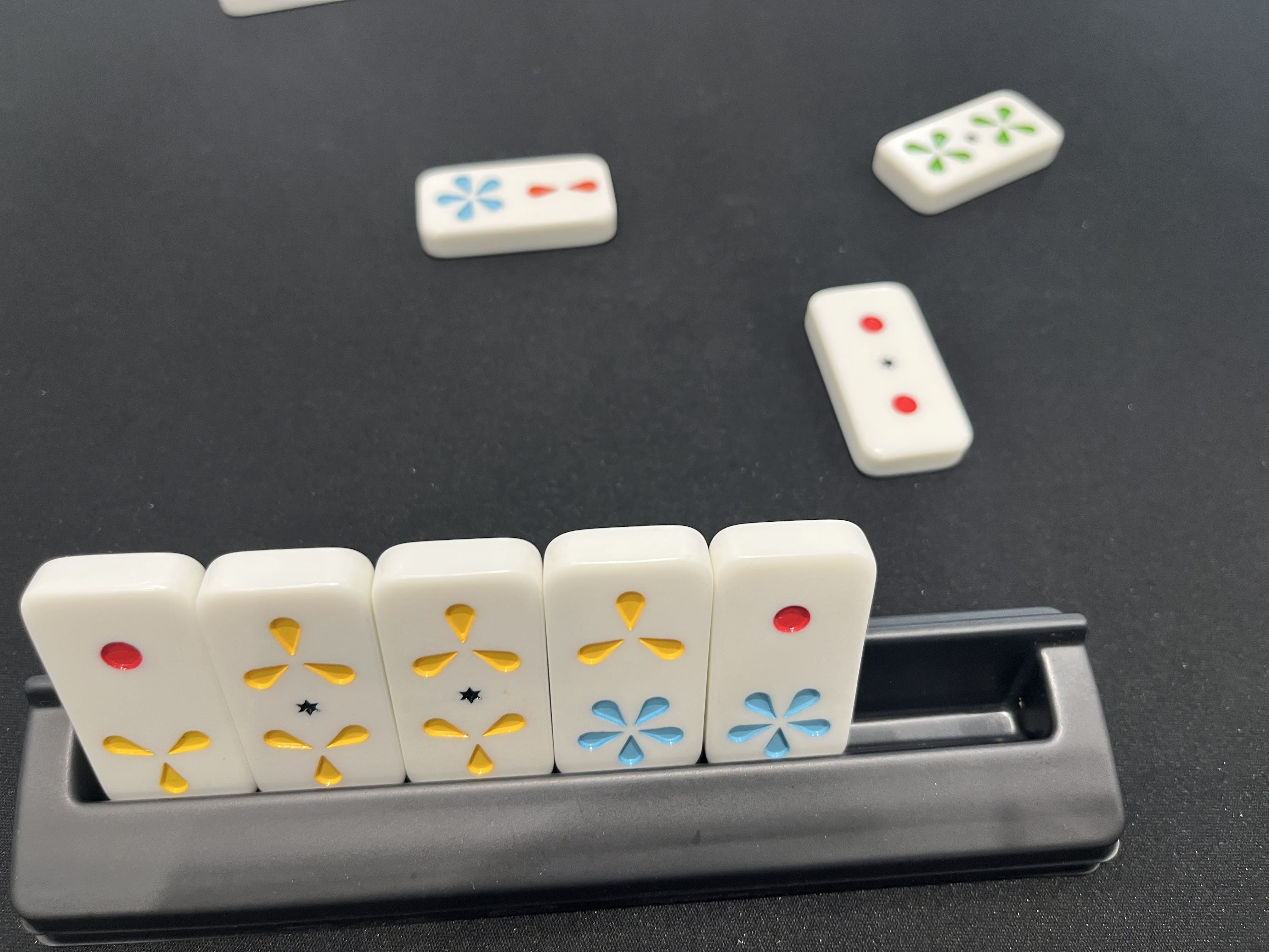 구성은 심플해요. 직사각형 타일 형태의 돌 36개가 전부인데, 각 돌은 숫자(1~6)와 색상(빨강, 파랑, 노랑)으로 되어 있고 촉감이 아주 좋아요.