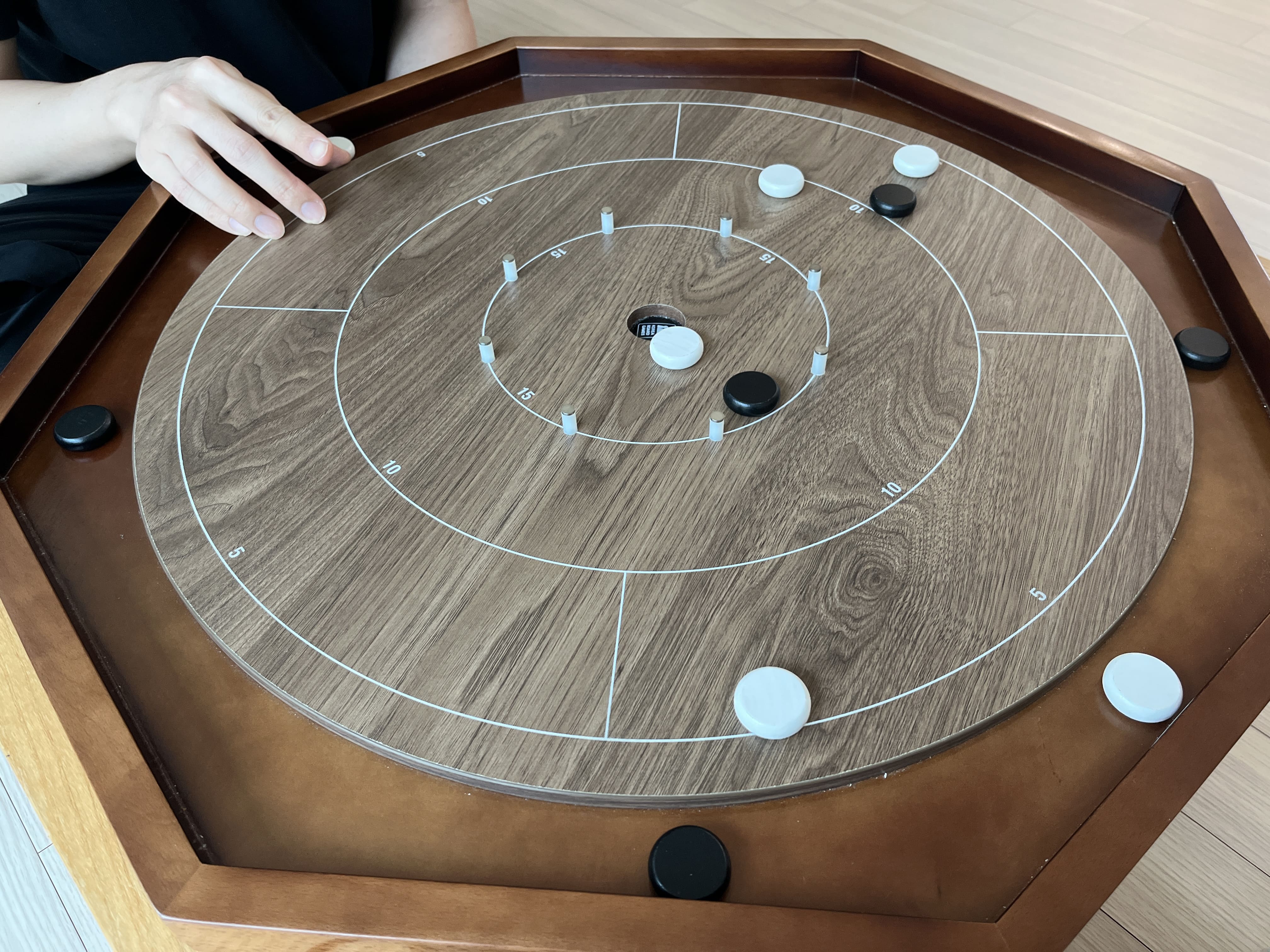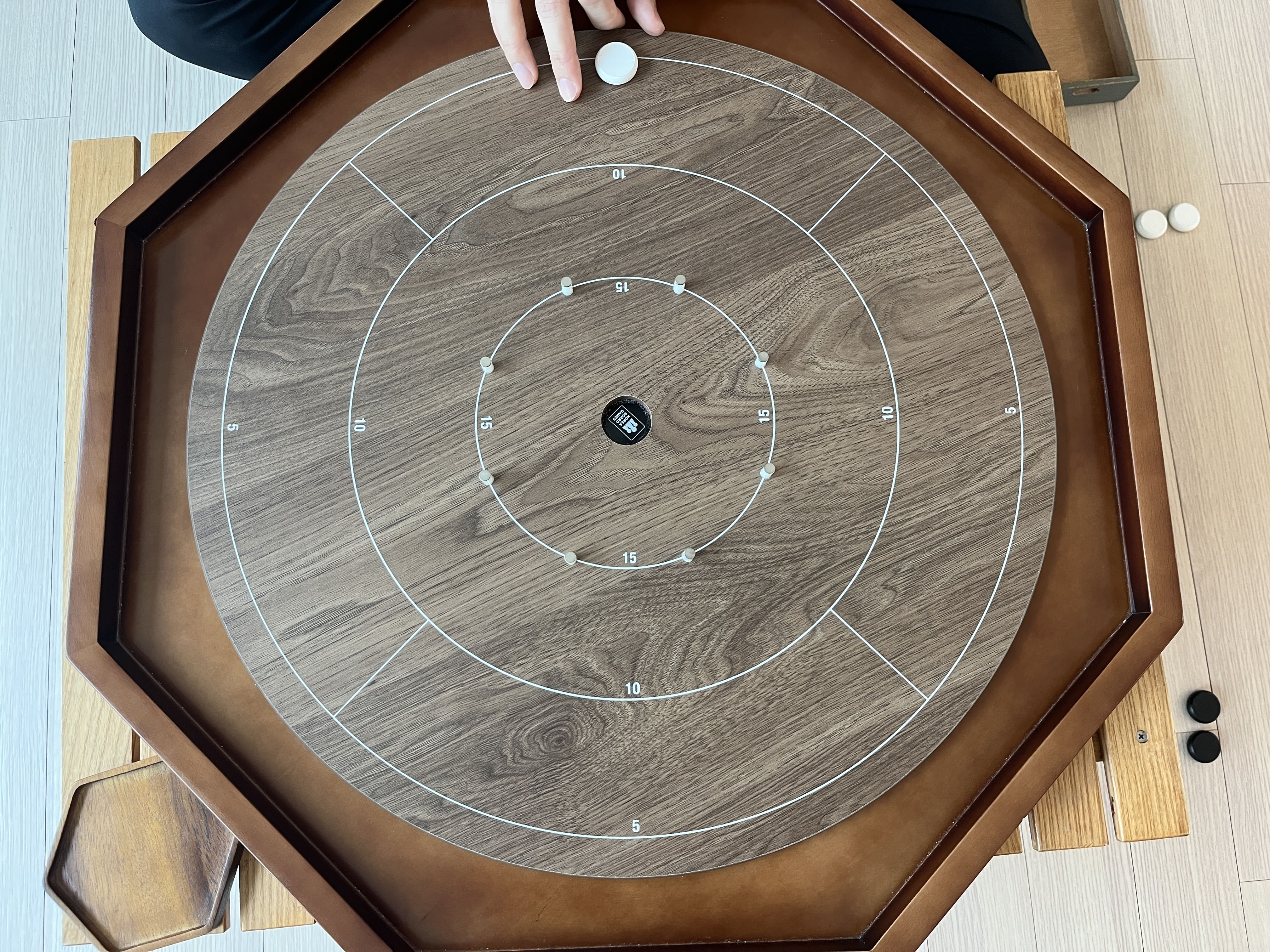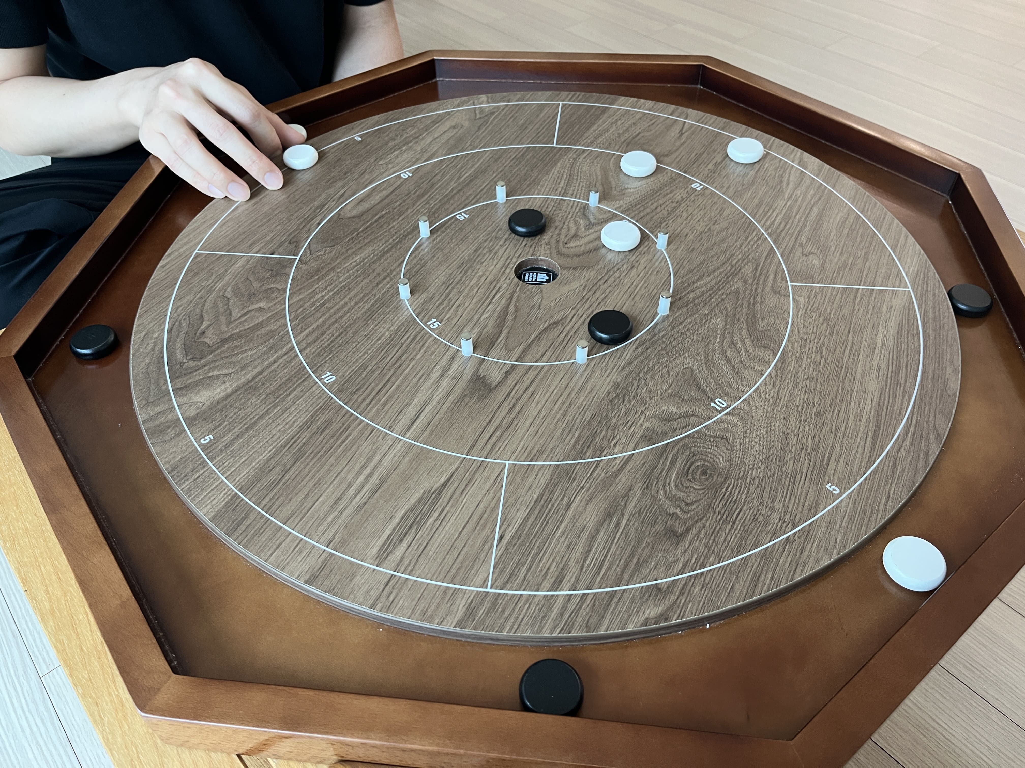 나무판 가장자리에 있는 흰 선 위에 자신의 디스크(원형 말)를 올리고,