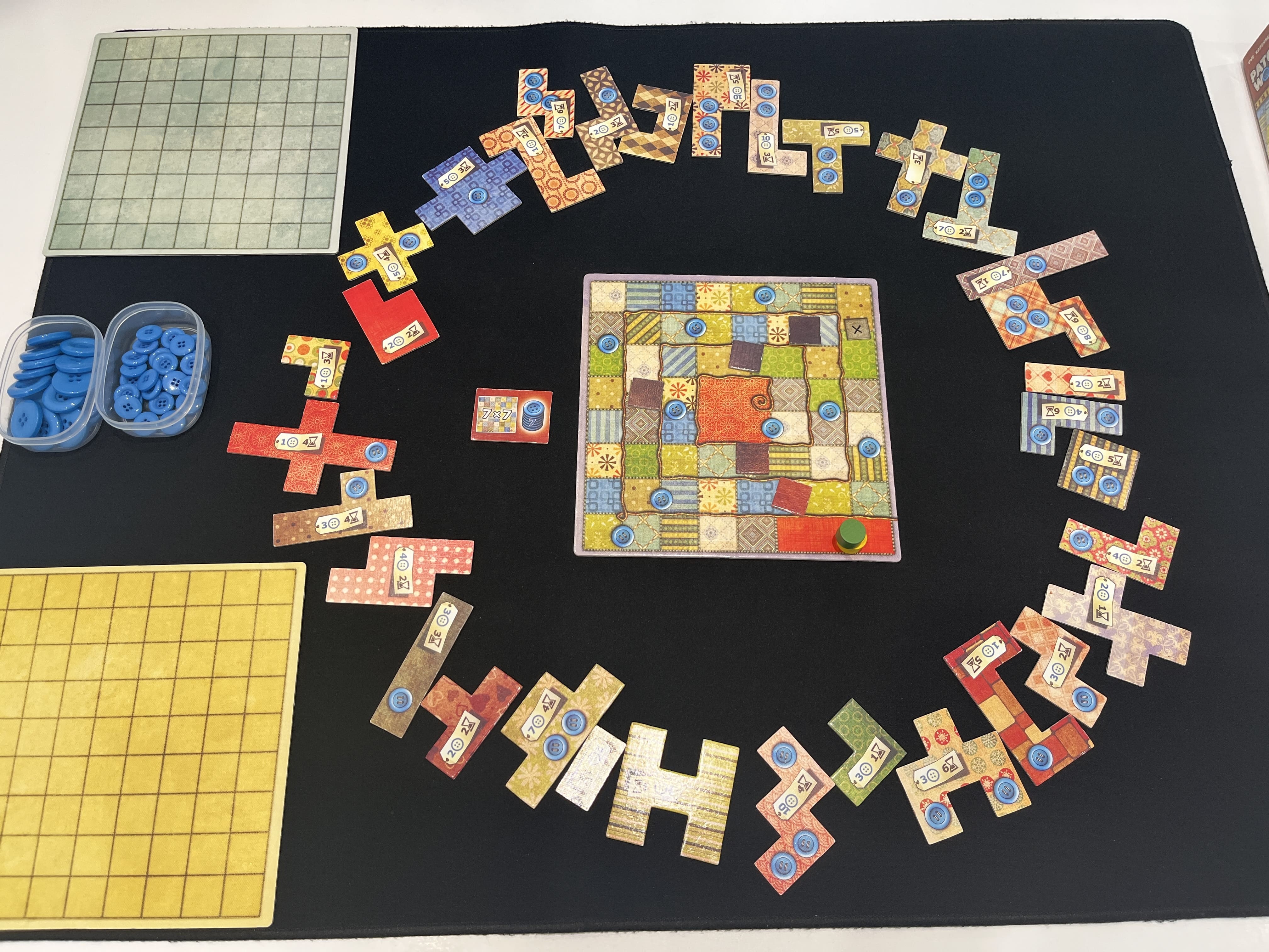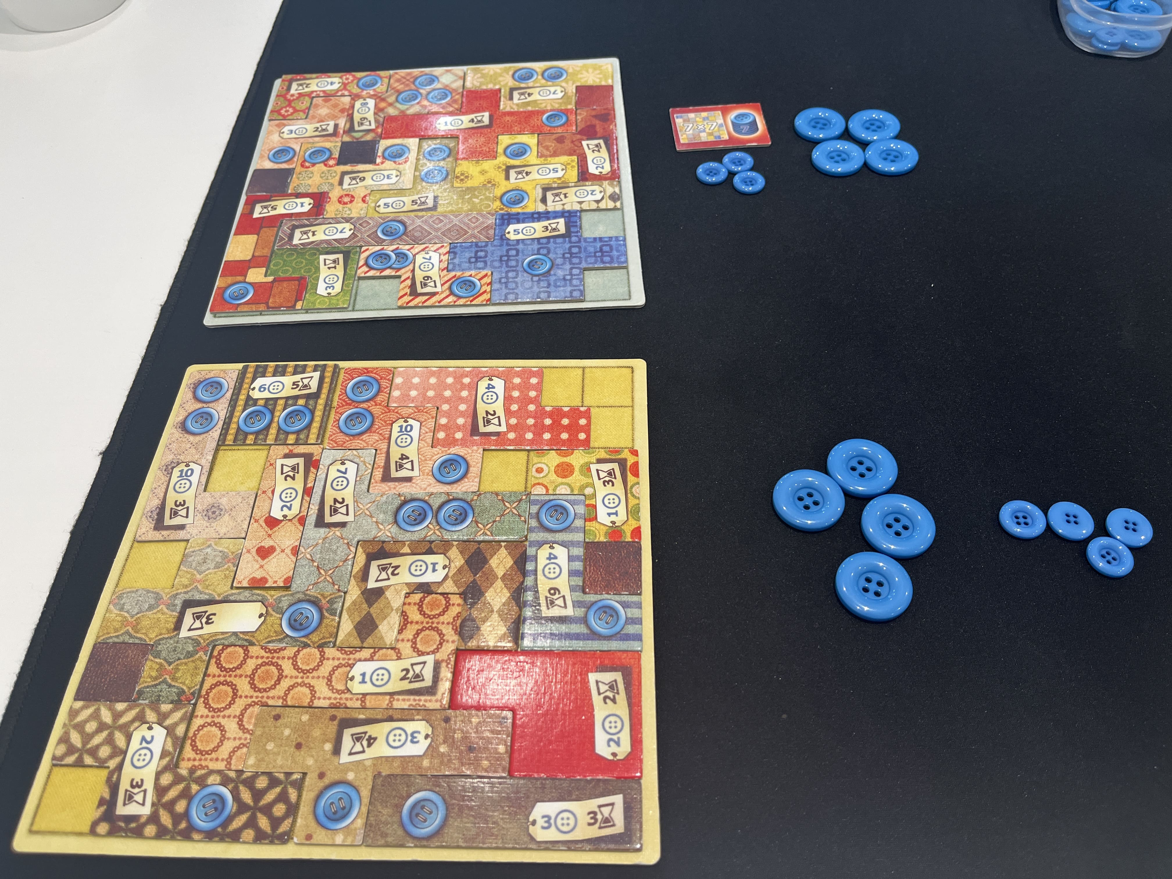 - 두 사람이 번갈아가며 퍼즐 조각을 구매해 개인 보드(퀼트 판)를 채워 나갑니다.