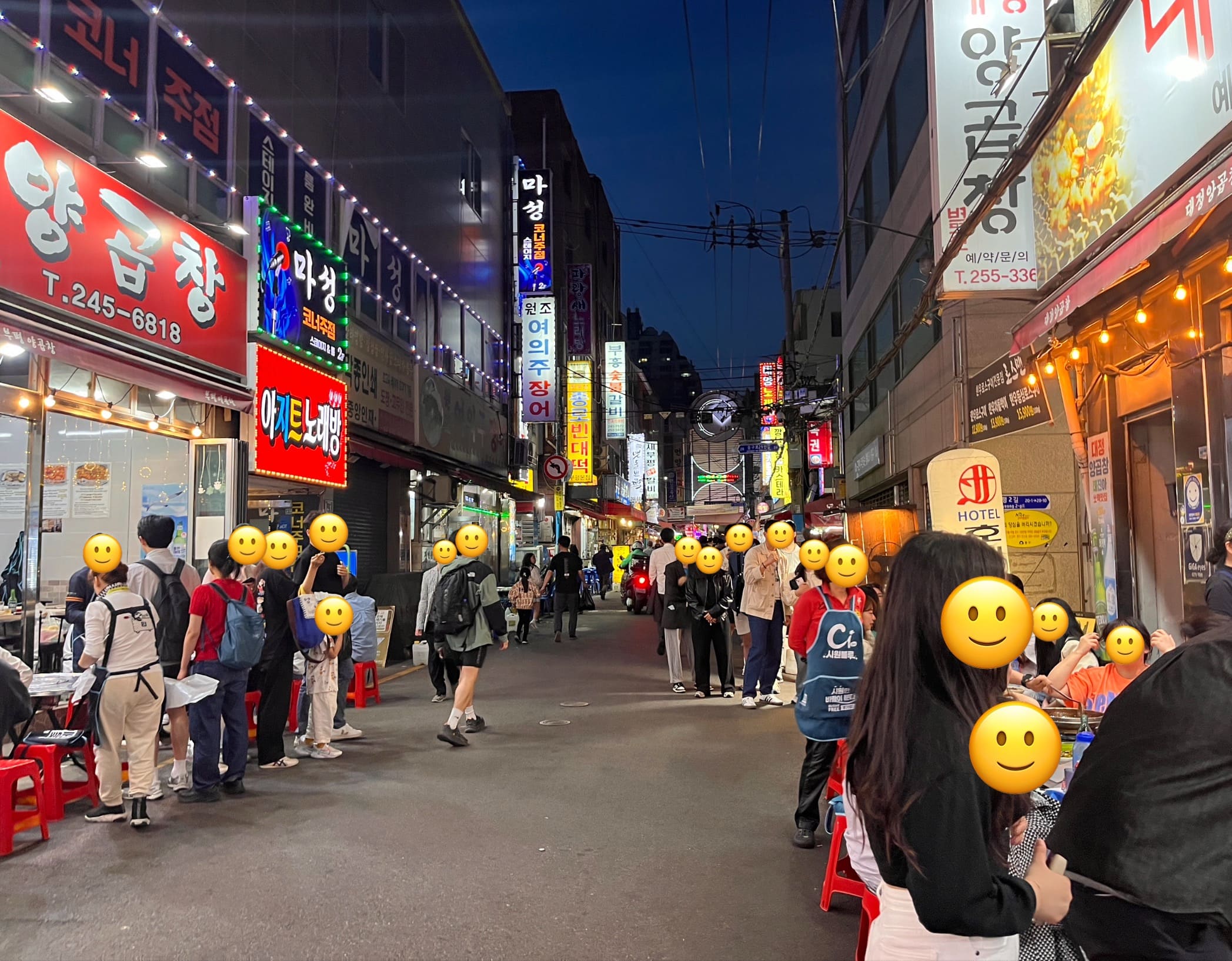 길에서 담배를 피우는 모습, 흥겹게 술잔을 기울이는 사람들, 현란한 간판들. 어쩌면 편하지 않은 풍경일 수 있지만, 우리는 용기를 내어 한 가게에 들어가 곱창을 시켰습니다. 아쉽게도 곱창은 기대와 달리 느끼했지만, 그곳에 간 것을 후회하지 않습니다. 너무나 재미있는 볼거리들이었으니까요!